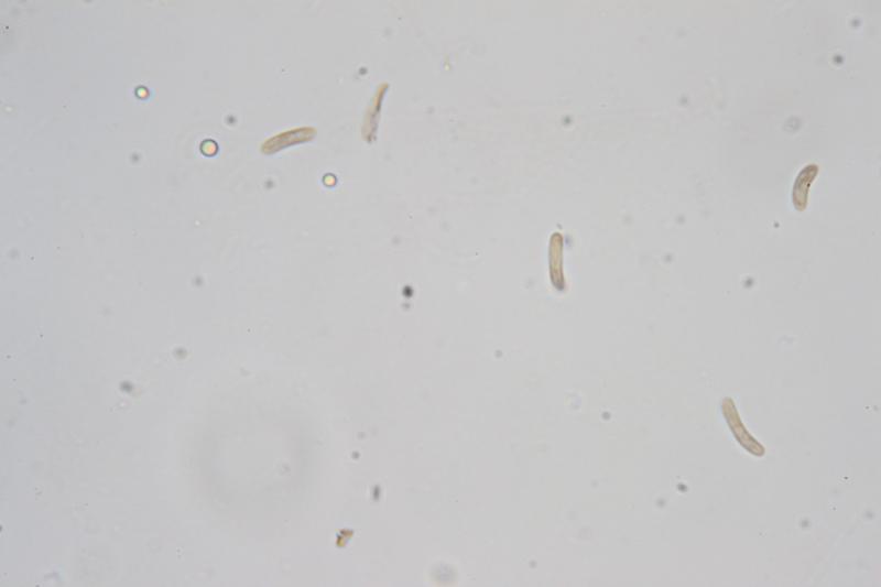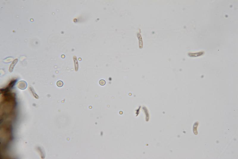 Spores allantoid, hyaline, slightly ocher-tinged with oil droplets