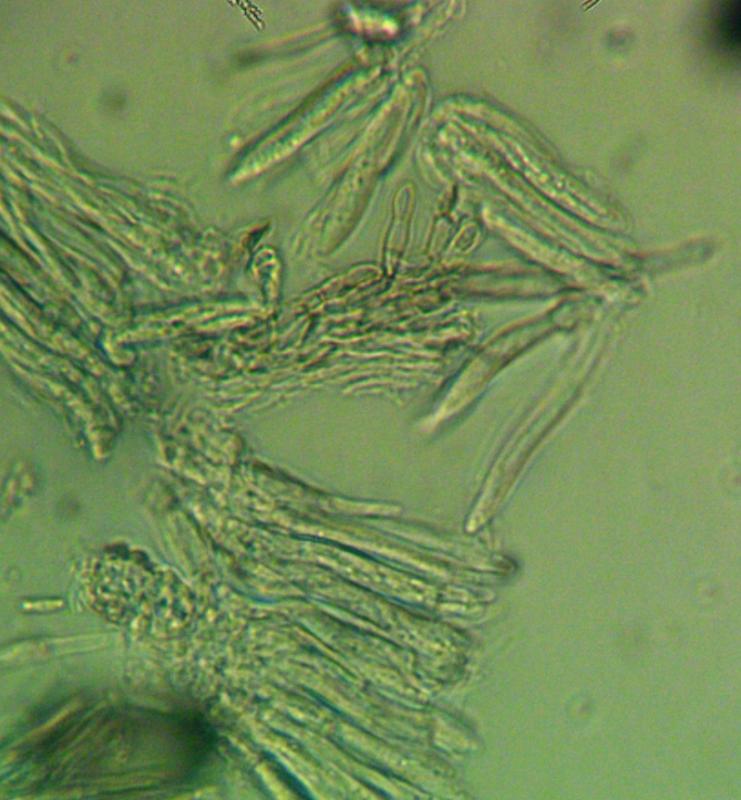 fruitbody ca. 0.30-0.4 mm, asci about 30 mikron, spores 6 mikron, border with unicellular hairs about 50 mikron long. Cell at base elongates, narrow, above somewhat isodiametric
