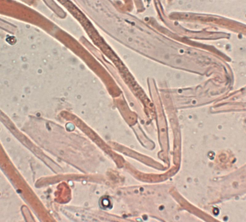Nothing is alive anymore there. But one image shows a splendid crozier. The third pic looks much like a simple-septate ascus, though, maybe only because the other septum is hidden?