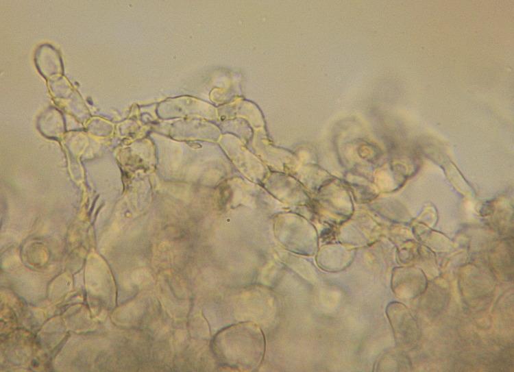 in O. concinna clade only caeruleopruinosa and flavidobrunneola have this type of paraphyses. But it seems there's no colourful exudate on the ectal excipulum - I would consider O. alutacea var. parvispora, although the spore size is around the lower end of range.