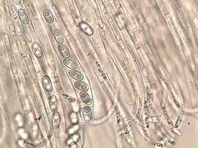 Excipulo ectal de pelos, hasta 140 x 15 la celula ultima de estos pelos hasta 30 x 15
