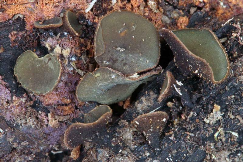 Great collection! Indeed a rare species. How large are the apothecia (diameter)? Did you identify the substrate? The wood surface is strongly blackened. Did you notice any black rhizomorphs from which the apothecia emerge? The anamorph of this fungus is sometimes present, stilboid with ochraceous hairy head.