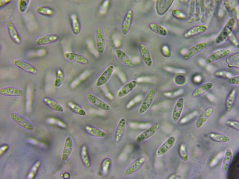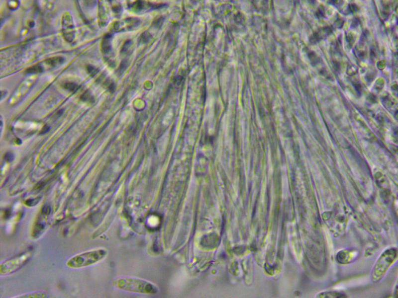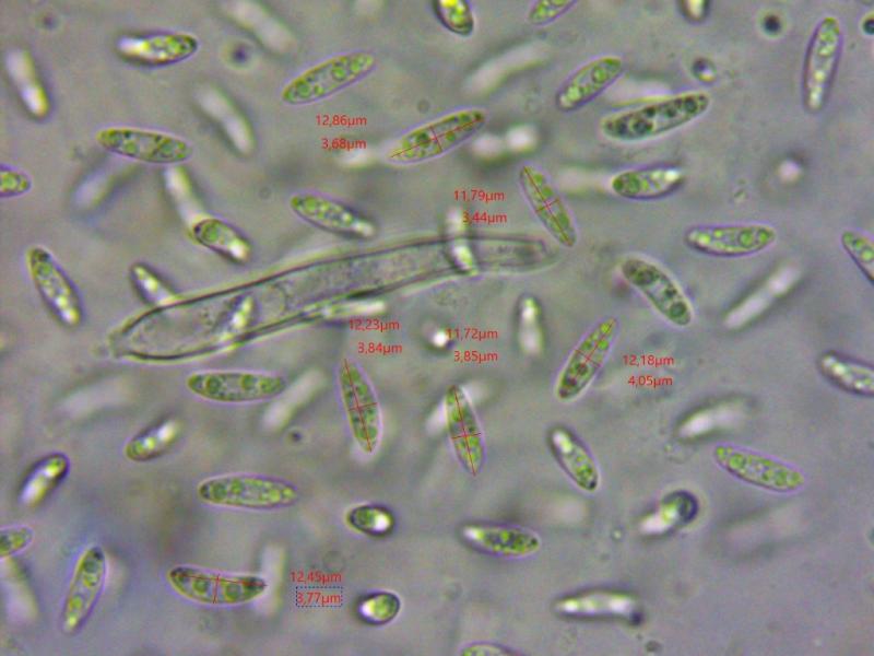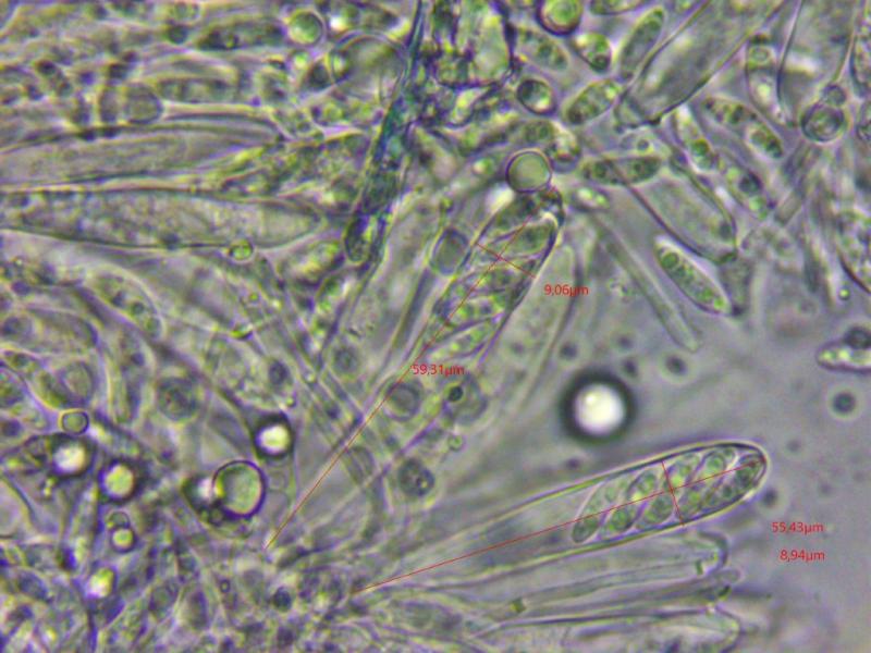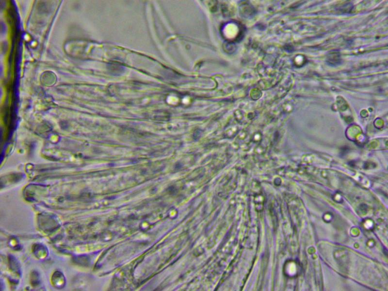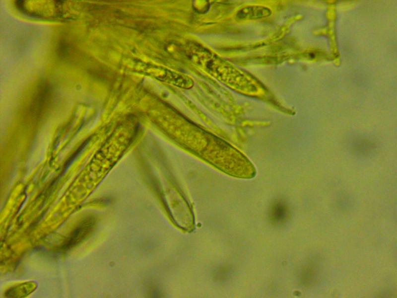 The apothecia remind of a Calycina, but the thin paraphyses do not have a clear vacuolar body. The spores are about 11-13/3,5-4 µm large and have a high lipid value. The asci have croziers and react slightly bluish (sometimes difficult to distinguish from dirty reddish) in IKI.