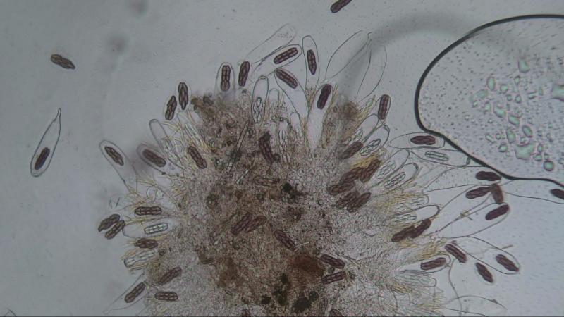 Parafhyses: 2.2-2.8 um, septated, wider on the tops 3.8-4.3 um, containing yellowish content.