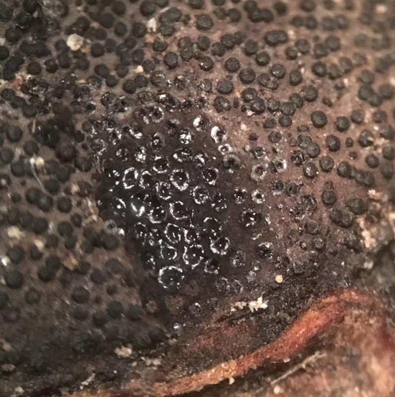 The ostioles are black discs against a brown stroma. They are not sulcate. I don't believe there is a sterile margin (perhaps by looking at the pictures see if you agree). The sterile tissue between the perithecia is black. (In the fourth picture it may look as though there is white material among the perithecia, but that is just light reflecting off the sectioned perithecia). The perithecia measure about .25mm wide by .5mm tall.