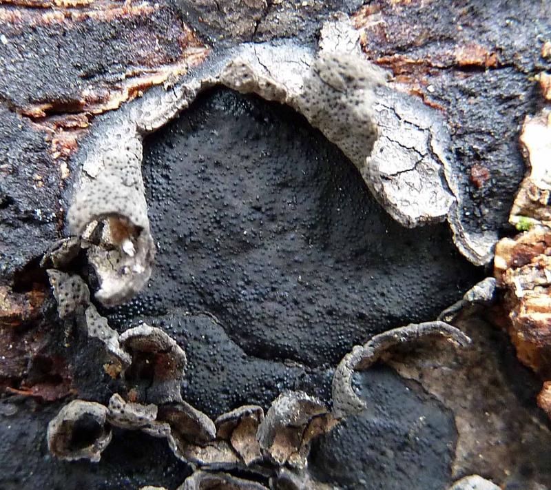 Unlike what Vasilyeva claims, you will not find a true sterile margin on stromata. What you can find at margin is just remnants of superficial "lid" originating from the bark that covers the stroma at early stages, like in Biscogniauxia and Camillea. This tissue is brittle and readily worn off, just leaving some small teeths sometimes visible around the margin of the stroma.