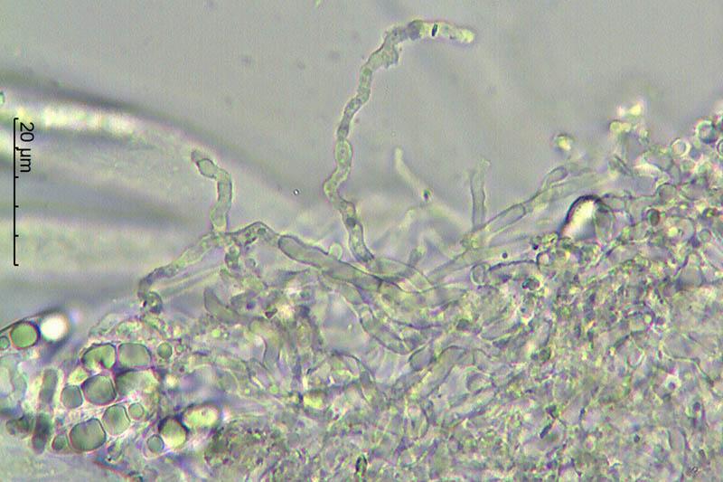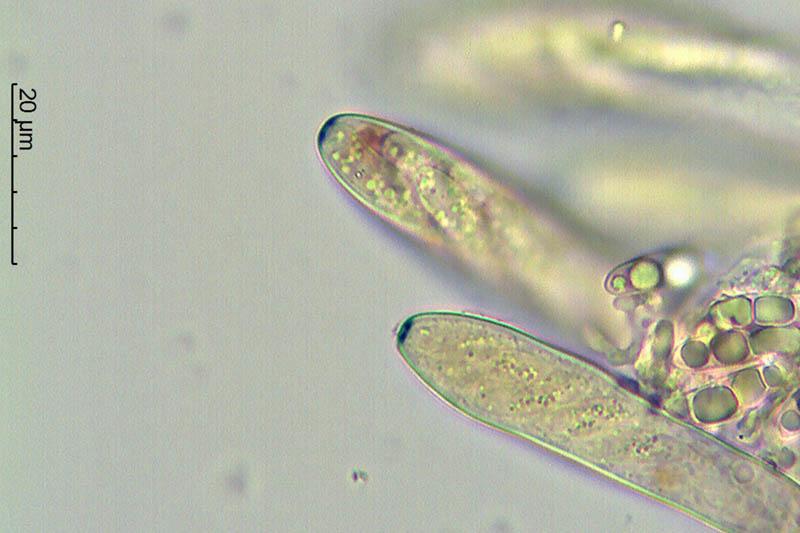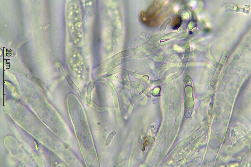 Esporas con ¿hasta 3 septos? y encontradas ya septadas dentro de las ascas. Con numerosas gútulas en su interior y que al madurar se agrupan en 3-4 más grandes. Medidas de 19-23 x 4,5-5,5 micras, aproximadamente.
