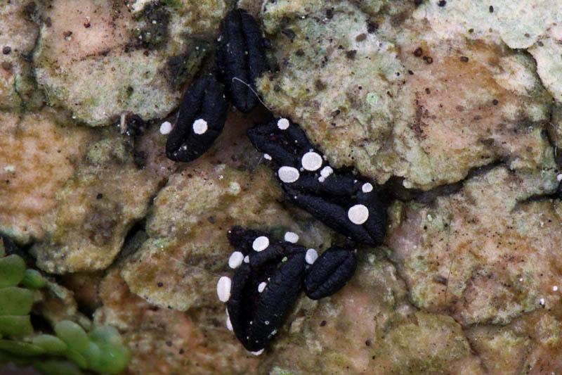 Subo unas fotos de unos pequeños ascos blancos que crecían sobre apotecios viejos de Eutryblidiella hysterina, en madera de Buxus.