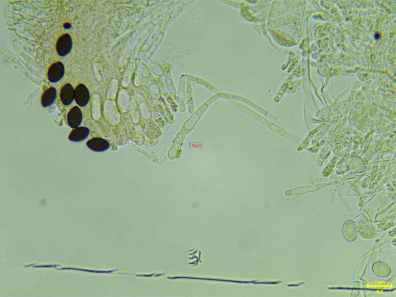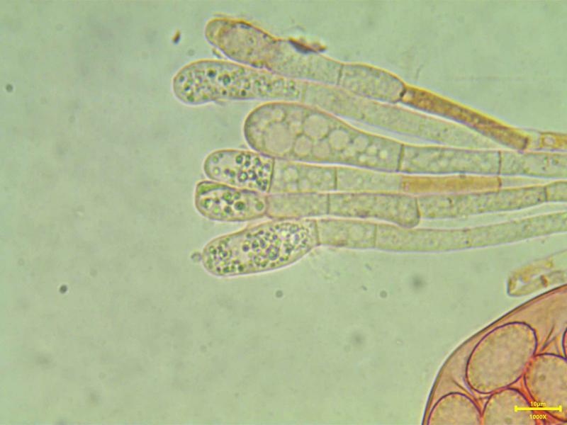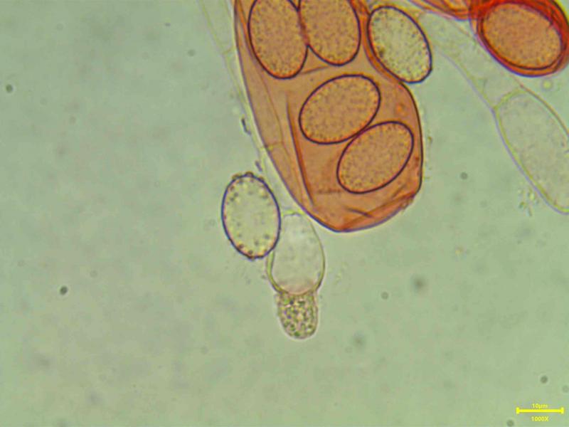 Asque claviforme 163x25µm, bi-sériés, IKI+ bleuissement entier de l'asque. Ascospores elliptiques ponctuées, ornementées 18.1x10.8 Qe 1.6. Paraphyses septées, retreint aux septs, vacuoles, renflées à l'apex 7-9 µ.