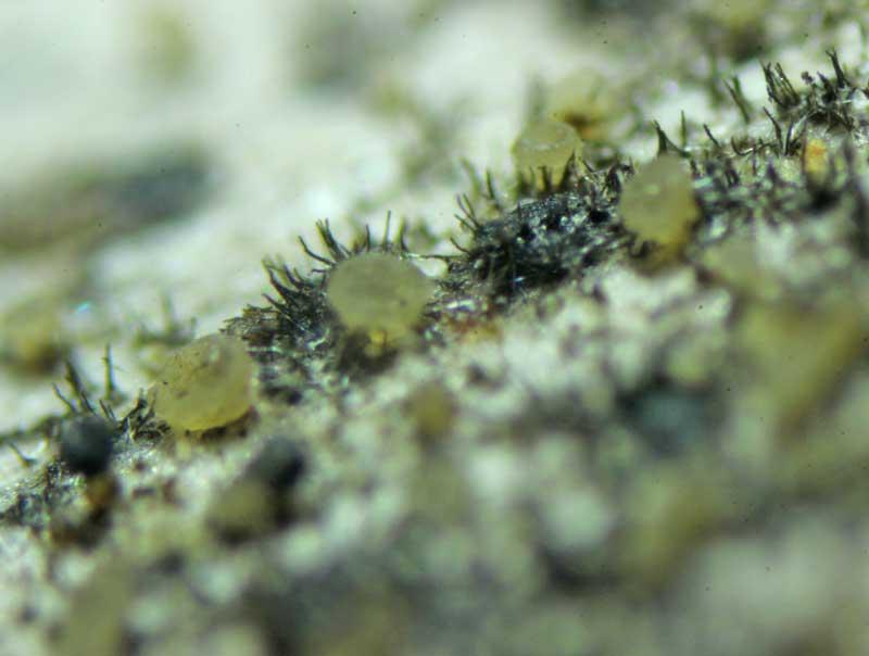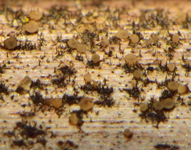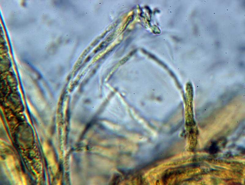 A Strossmayeria (generally S. basitricha). The dark setae are the anamorph with large brown septate conidia.