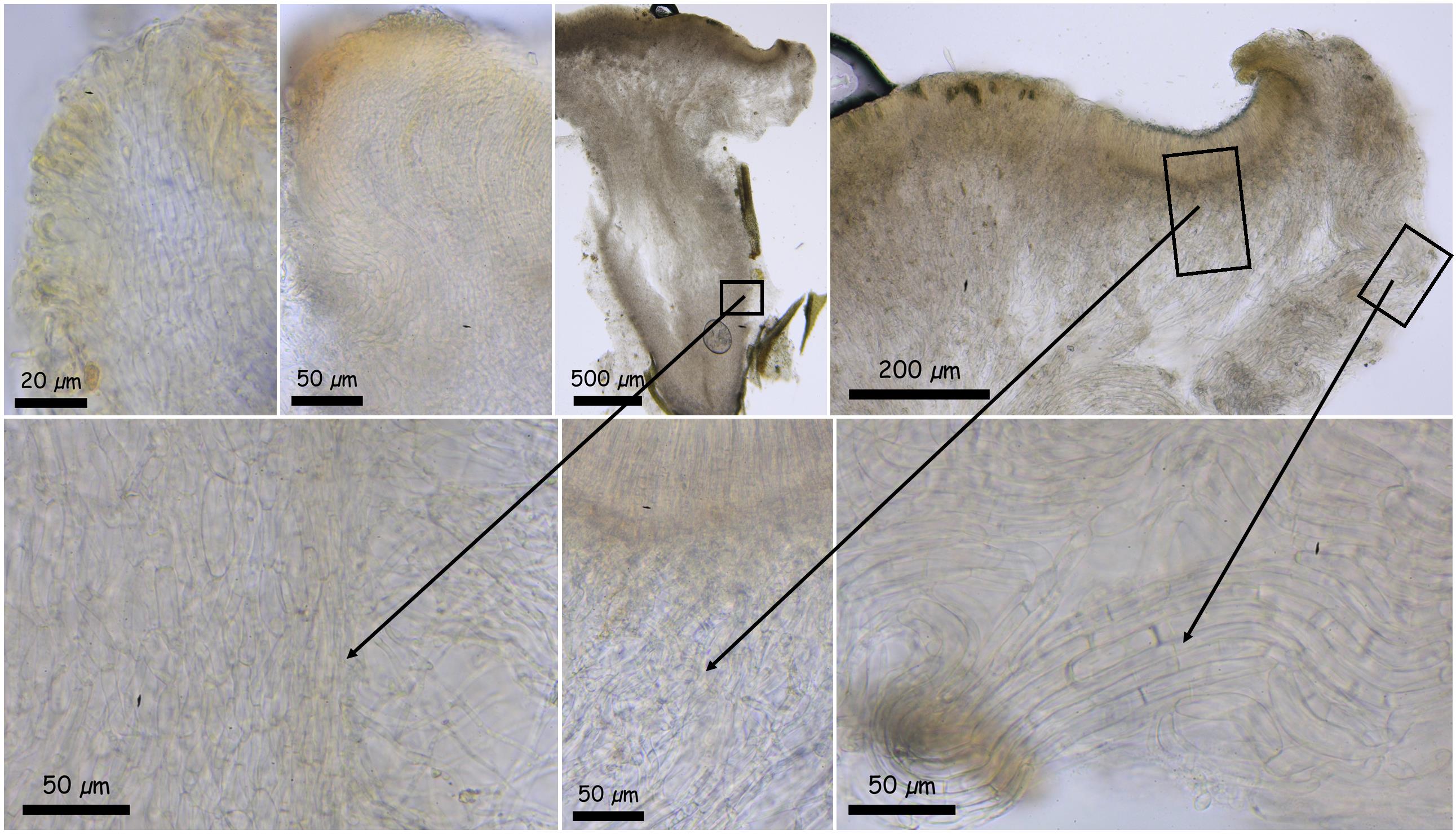 El excípulo ectal está compuesto por células de textura prismática y el excípulo medular es de textura intrincata.