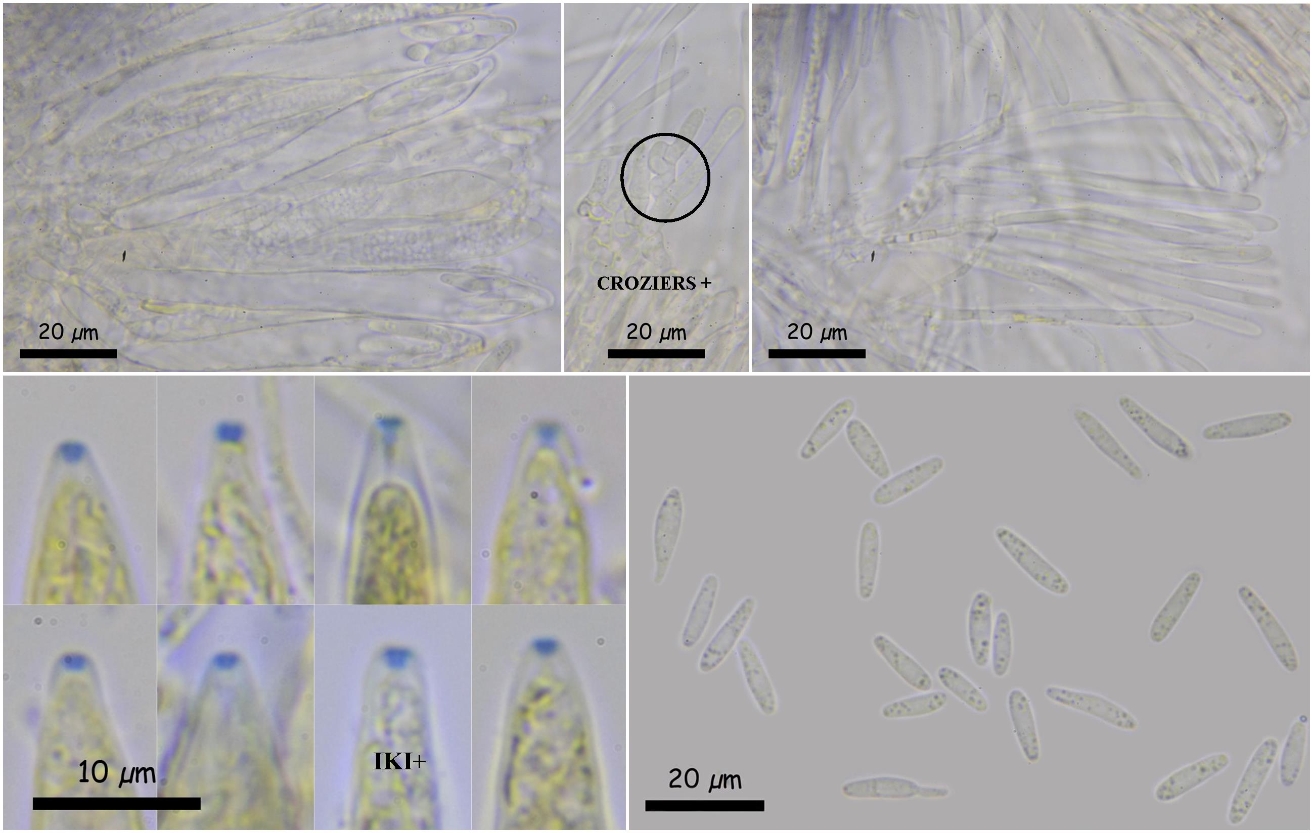 Ascas cilíndrico-claviformes, estrechándose en el ápice, de (83,4) 86,6 - 104 (115,6) × (8,8) 8,9 - 10,9 (11) µm; N = 13, Me = 97,3 × 9,9 µm, con el poro apical euamiloide de tipo Calycina y croziers en la base.