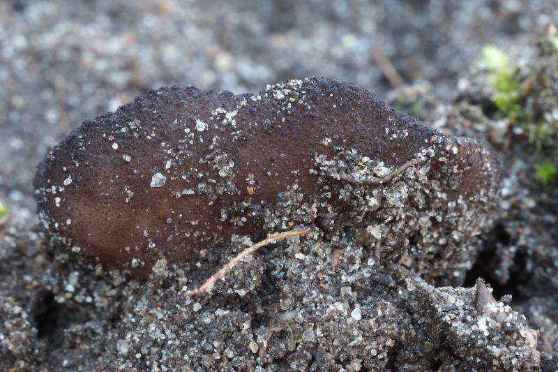 Fruitbody 25 mm wide, dark brown with a hint of violet (especially obvious in direct light). Outer surface with a lighter brown colour and grainy.
