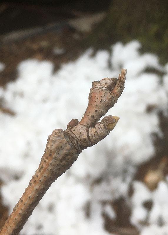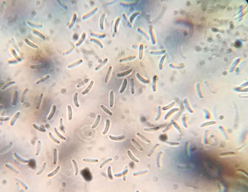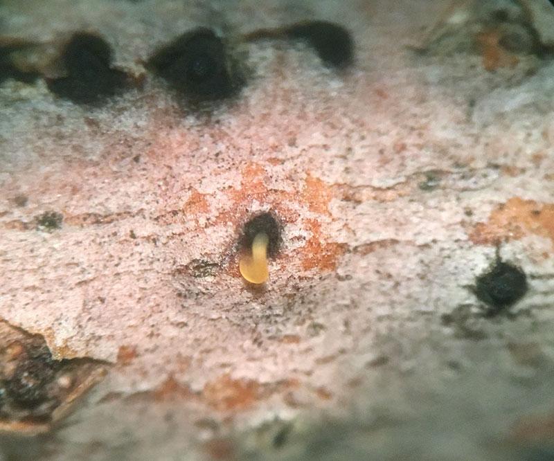 Found under Platanus occidentalis, although I can't prove that the twig comes from that tree. A mostly immersed anamorph showing black eruptions at the apex of a swollen pustule beneath the bark layer. When hydrated they began to extrude gelatinous threads of conidia. The conidia are hyaline, allantoid measuring about 6.5-8 x 1.5-2µm. Does this look familiar to anyone in this forum?