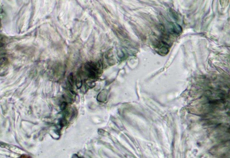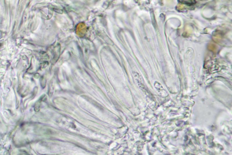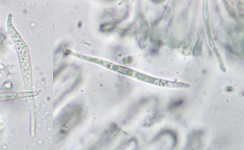 Spores : 28-40 x 1,5-2,5 µm, filiformes à un peu lancéolées, guttulées, hyalines, lisses.