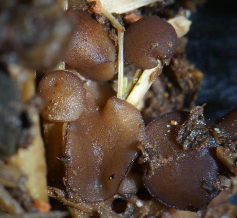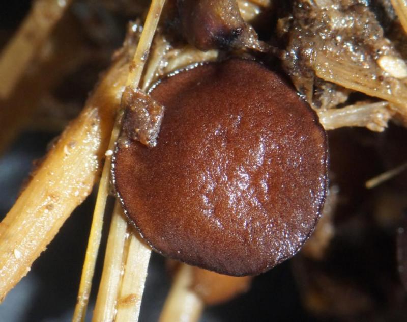 Fruitbody: brown - reddish brown, 0,8 - 1,5 cm, hairs very sparse