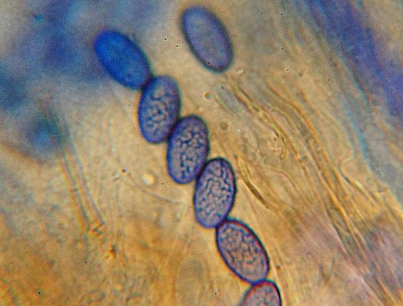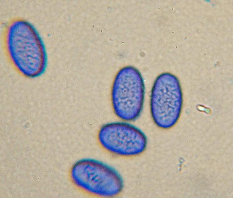 Spores: 11 - 13 x 7 - 8 µ, length / wide q 1,6 - 1,75, young smooth, mature ornamented ( with cotton blue )