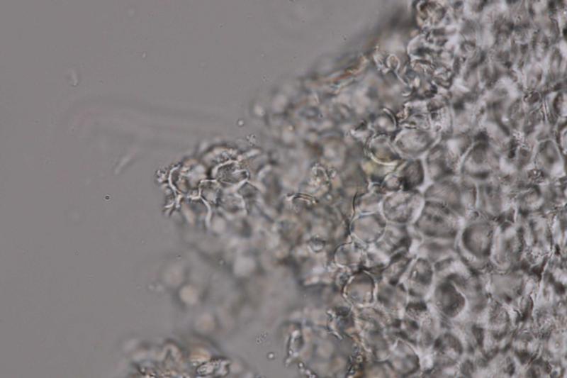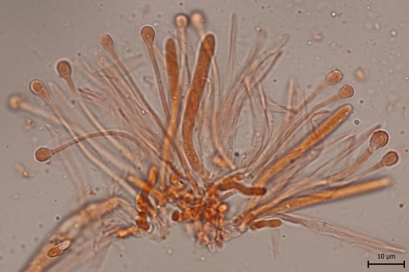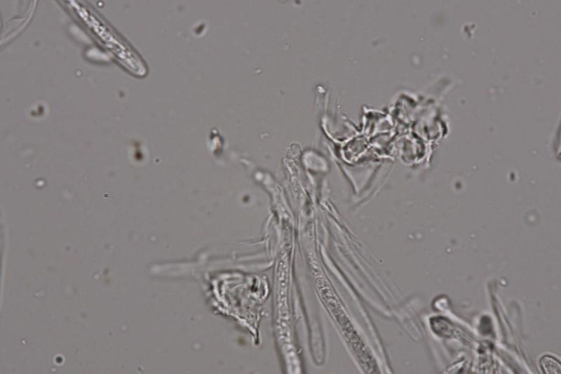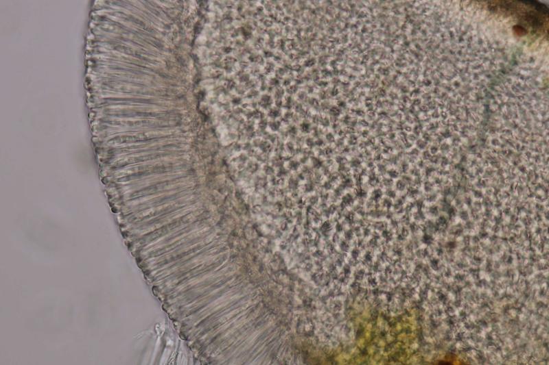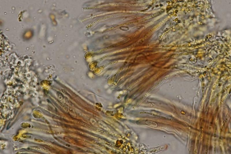 There are some remnants of hairs clustered into "teeth" (cf. "Pezoloma" or "Echinula"). The paraphyses are just lovely: they are strikingly swollen, kind of "balloon-on-a-stick". Asci relatively small as well as the spores (ca. 6 x 3 um) Spores with septa.