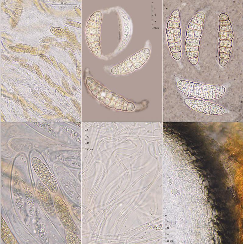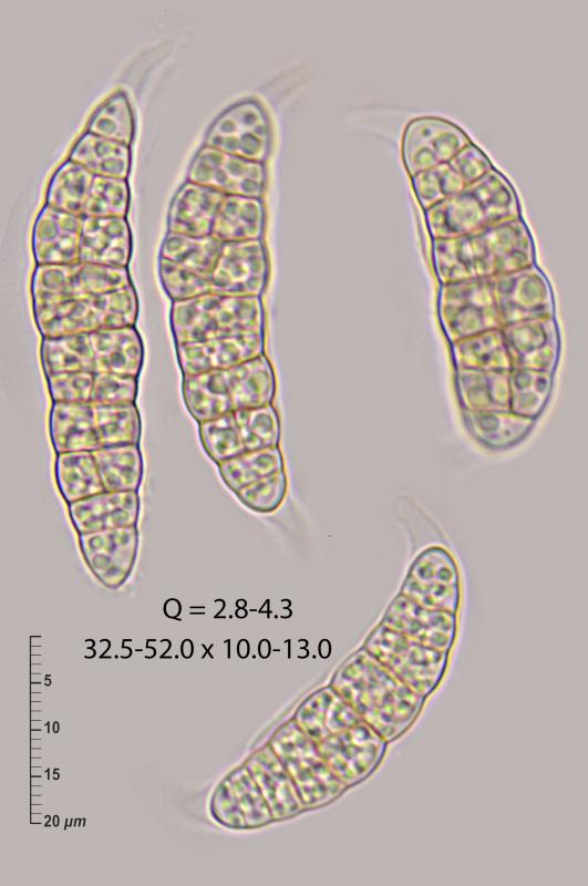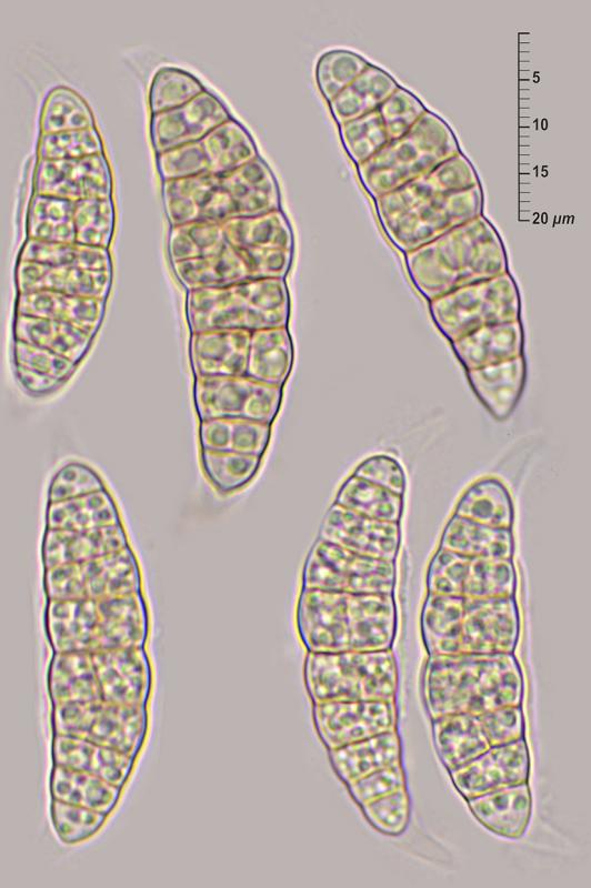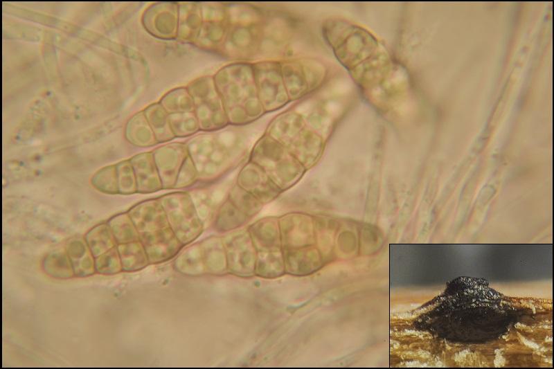 The globose pseudothecia 0.4-0.5 mm in diameter are just inmersed under the periderm and they have a conspicuous flattened papilla. Mature golden brown dictyospores have a thin mucous sheath thickened at the ventral side and long terminal appendages.