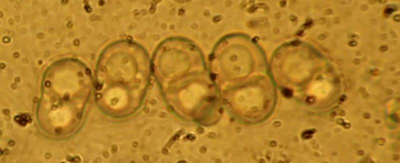 Spores, with on septum 18-22 x 10 my.