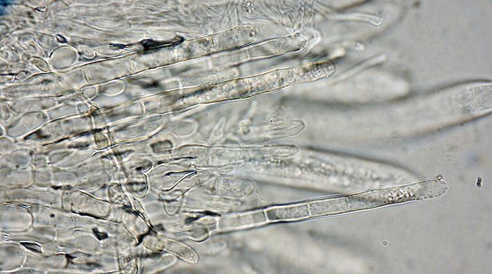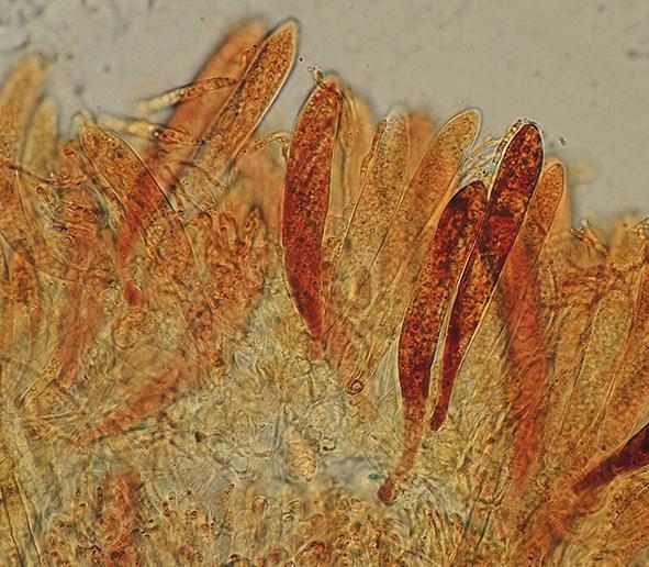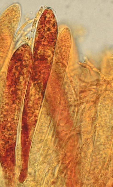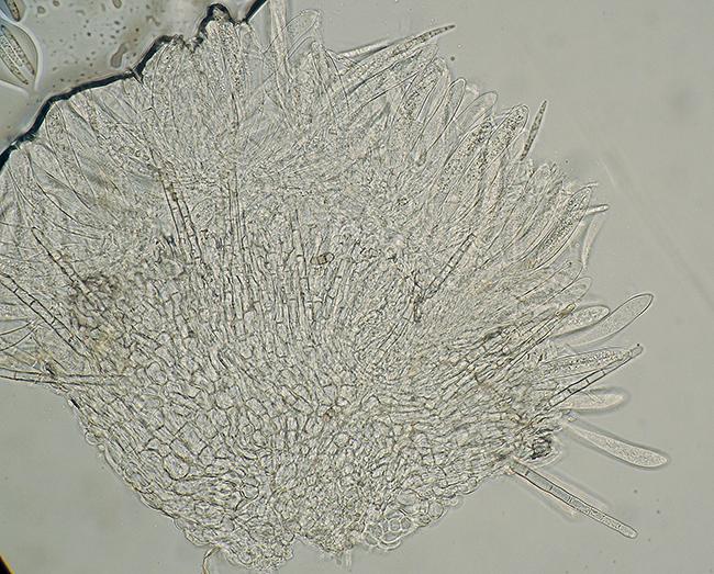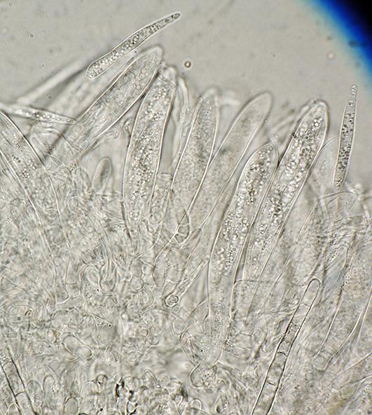 damn - I saw this too late - no more fresh material at hand. I sampled a solitary dead Pinus silvestris in a mire with lots of Calicium, other lichens etc. On the inside of the sun bleached surface various discos were about and also Dacrymyces tortus. It was the sixth Danish record: https://svampe.databasen.org/taxon/10498