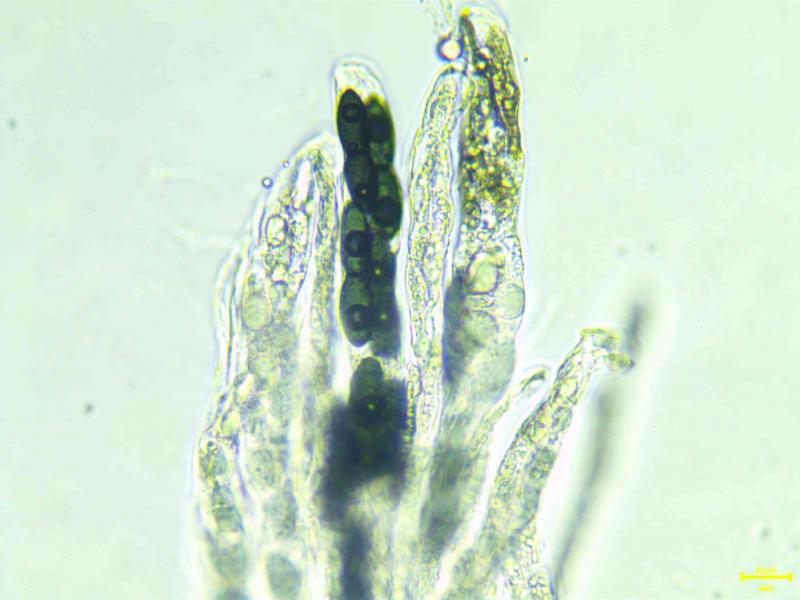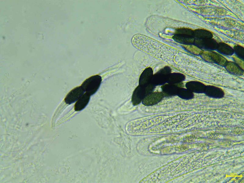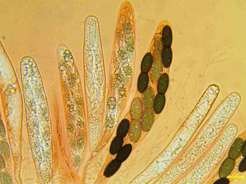 Asques parfois claviformes, uni et bi-rériés, octosporés, 320-358 x 32 - 43 µm.