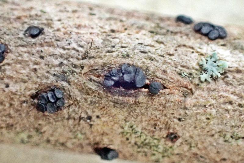 Apothécies groupées par 1-8, érumpantes, à chaire assez résistante, noires que ce soit sur l'hyménium ou la surface externe
