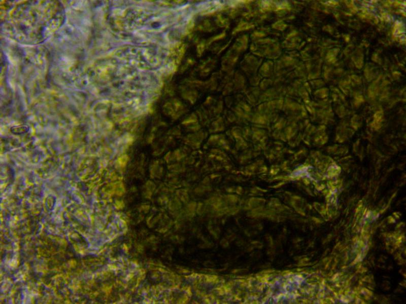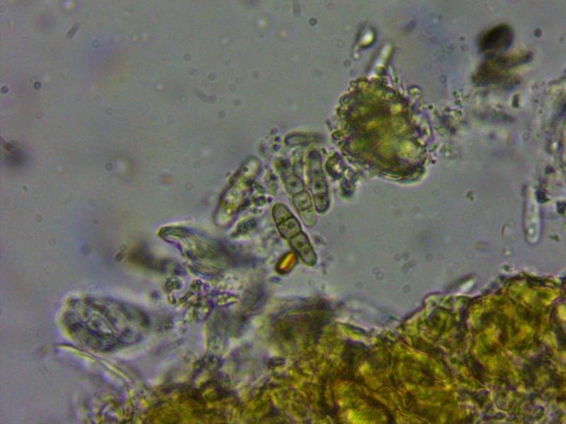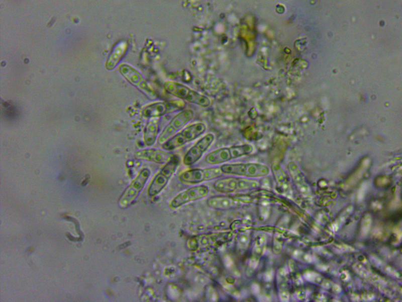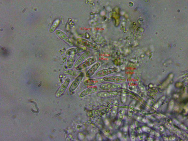 The 2-celled spores measure about (11)-13-14/3-4 µm; they àre hyaline for a long time but seem to become brownish with age (last foto).