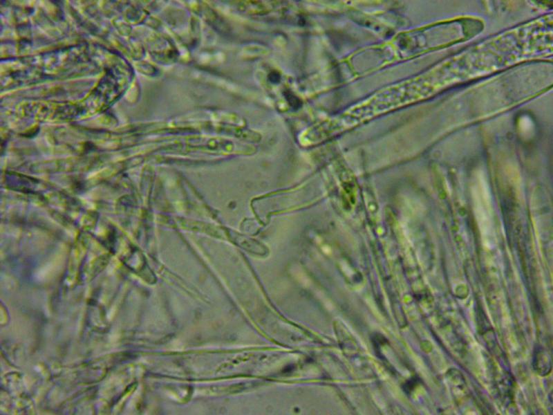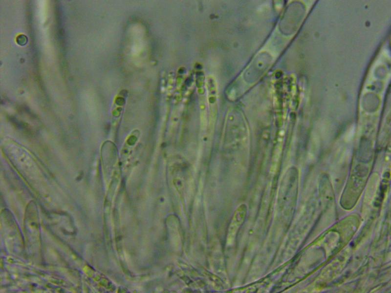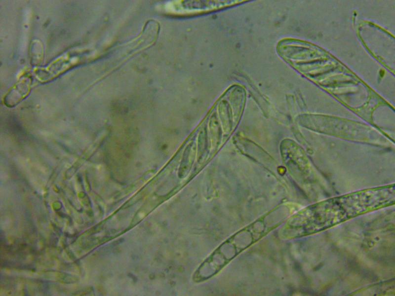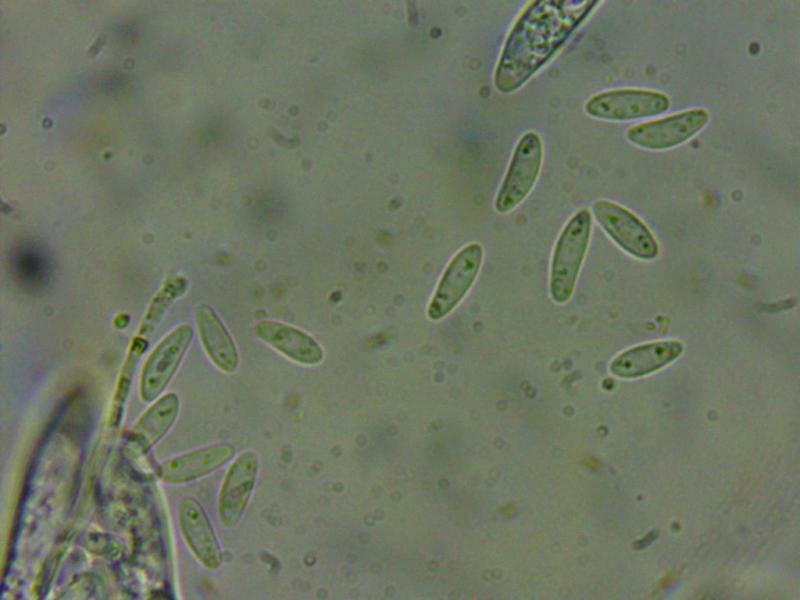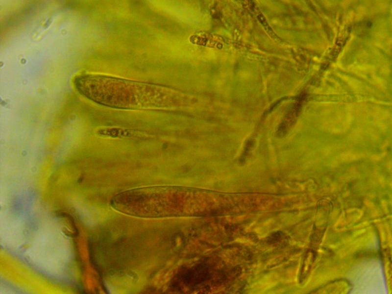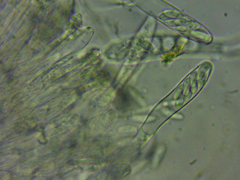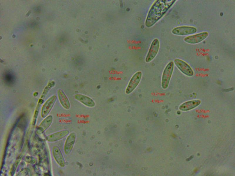 The asci are IKI+ (blue) and have croziers. The spores measure about (10)-11,5-12,5-(13,5)/3,5-4,5 µm.