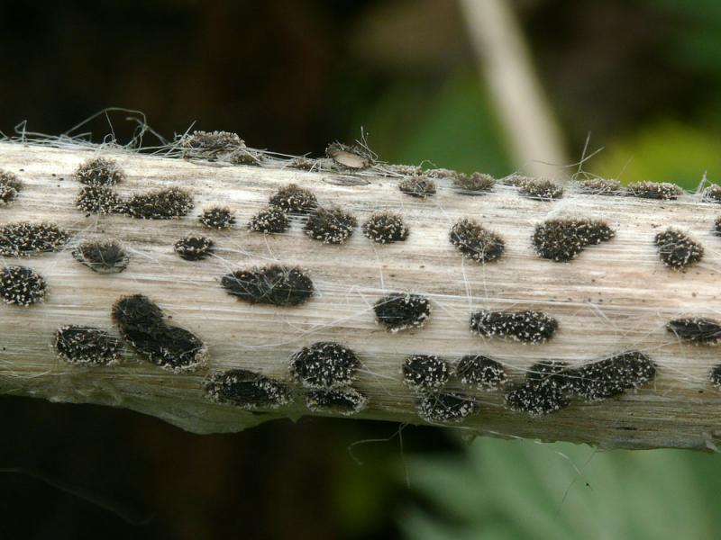 Par coïncidence, j'ai trouvé le même champignon sur rubus aujourd'hui et sur internet j'ai trouvé une explication pour la sclérotium noire. Voici le lien :