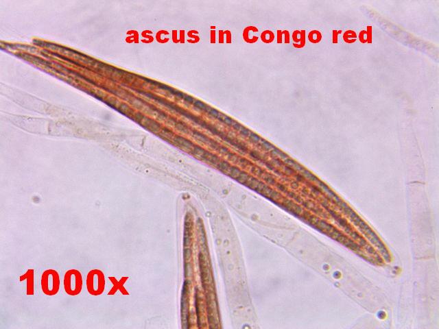 In the second examination, three days later, there were winding threads visible at both ends of the asci. These threads grew from each individual spore. In Congo red the "healthy" asci react strongly as well as the apical apparatus. I wonder if, what I thought to be paraphyses, are perhaps parasitic conidiophores?