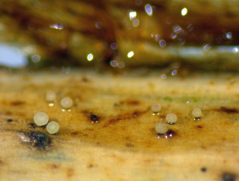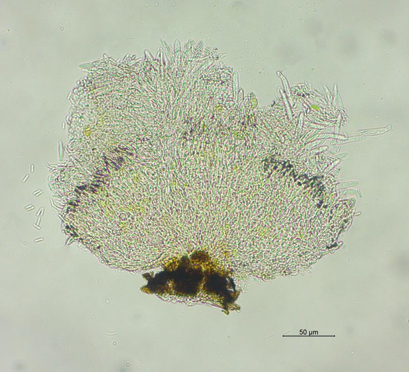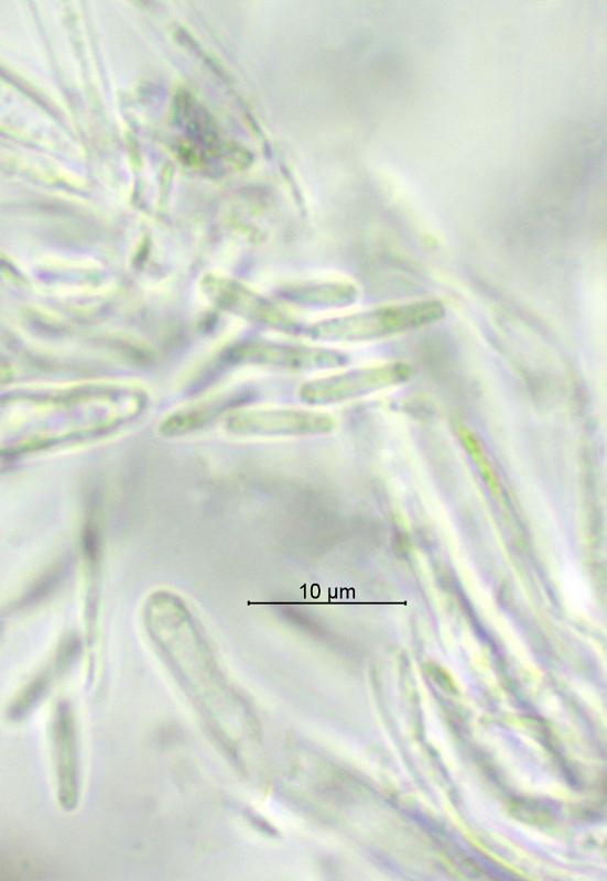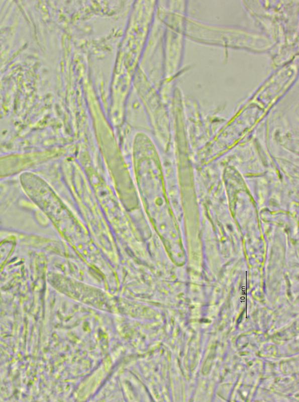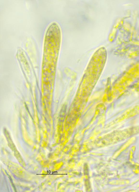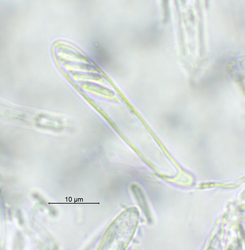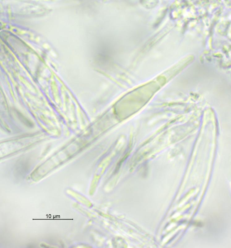 Voici un asco sur tige morte d'Athyrium (forêt à 920 m), apothécies 0.1 - 0.15mm de diamètre, cupuliforme, stipitées, l'hyménium jaune pâle, asques octosporés, 33 - 44 x 5 - 6 µm, à crochet à la base, IKI+, spores lisses, hyalines, 8 - 9.5 x 1.25 - 1.5 µm, paraphyses lancéolées, réfringentes.