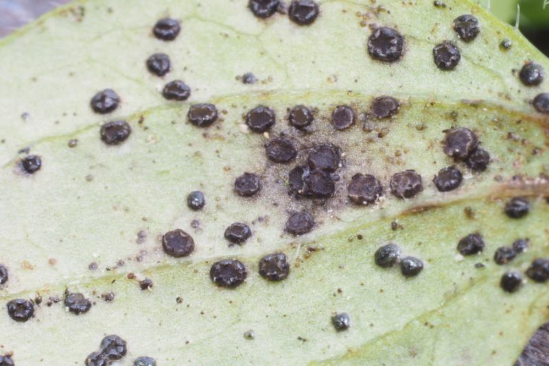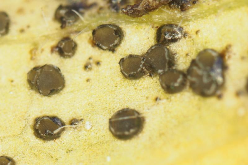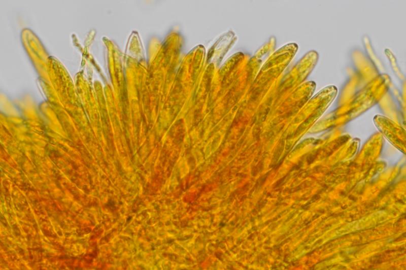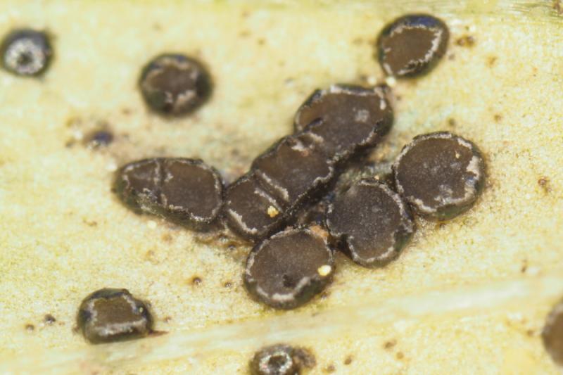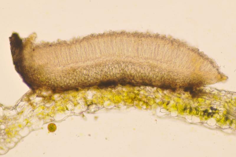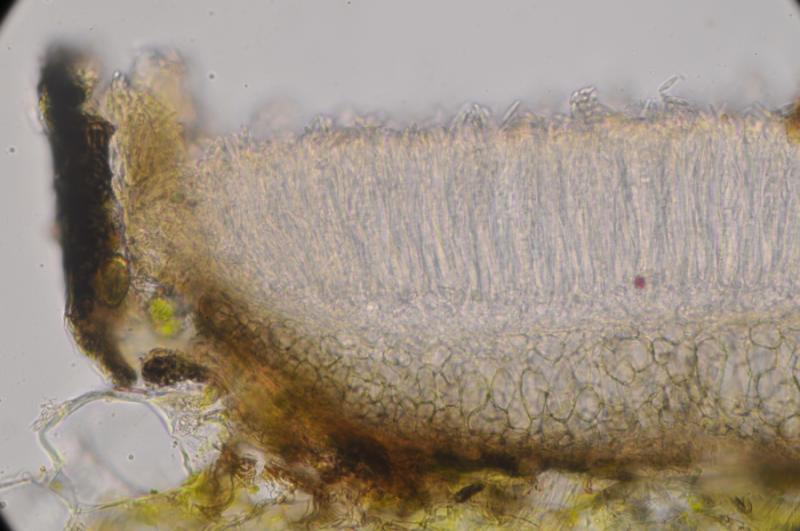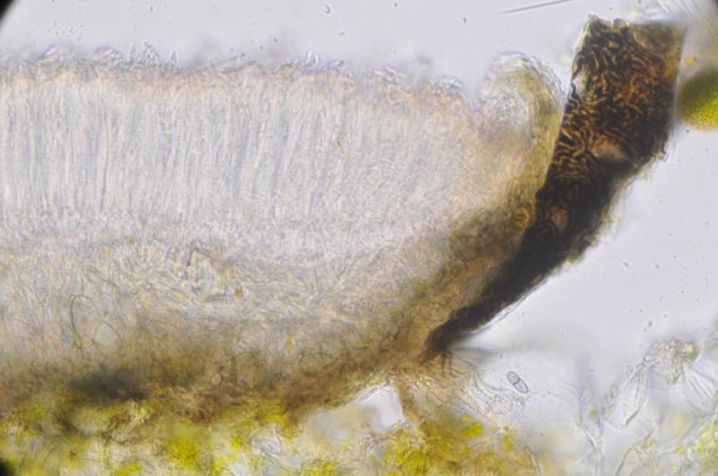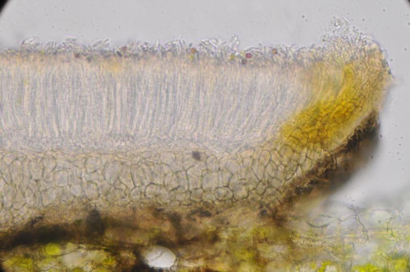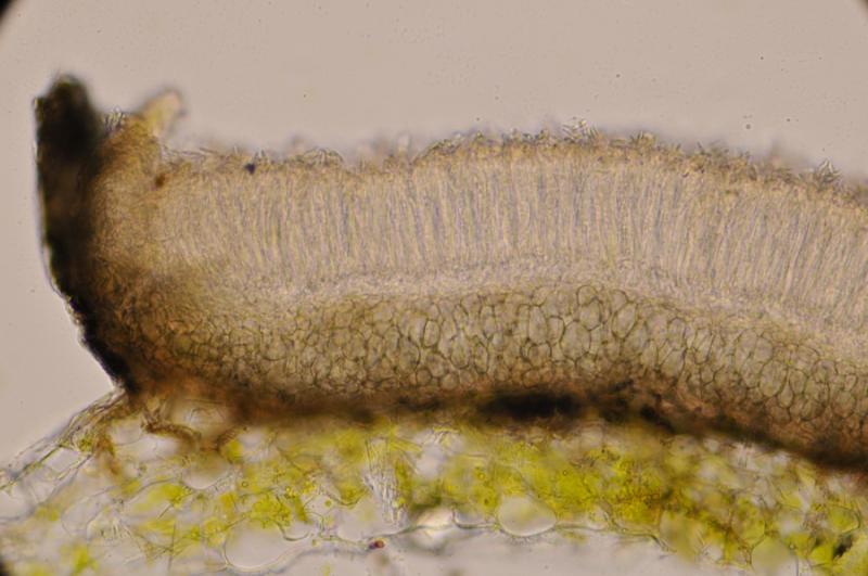 Apotecios en hojas verdes de la planta viva de Cruciata laevis, gregarios, semicerrados por medio de lacinias oscuras, pero que se abren en presencia de humedad, himenio color oliva, de (739) 740.1 - 816.6 (820.7) × (165.6) 167, 3-180,5 (183,3) m; N = 9; Yo = 783 × 173.3? M.