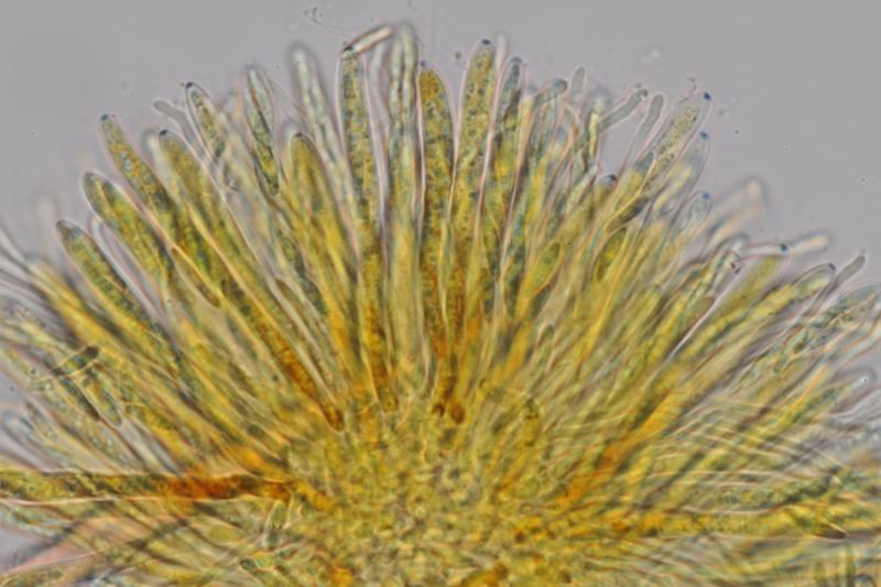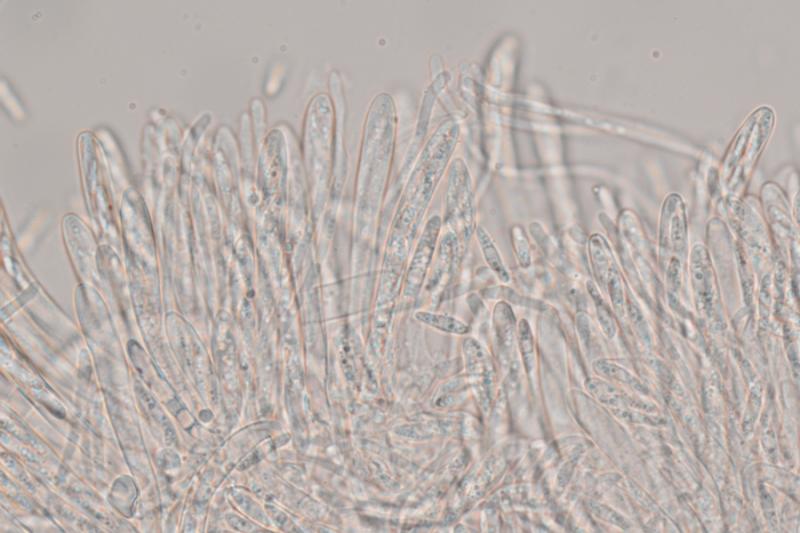 Asci Octospor, biseriato, cilíndrico, con croziers y hemiamiloides, de (66.4) 71.8 - 92.2 (95.2) × (5.3) 5.6 - 7.1 (8)? metro; N = 31; Yo = 83.8 × 6.4? M.