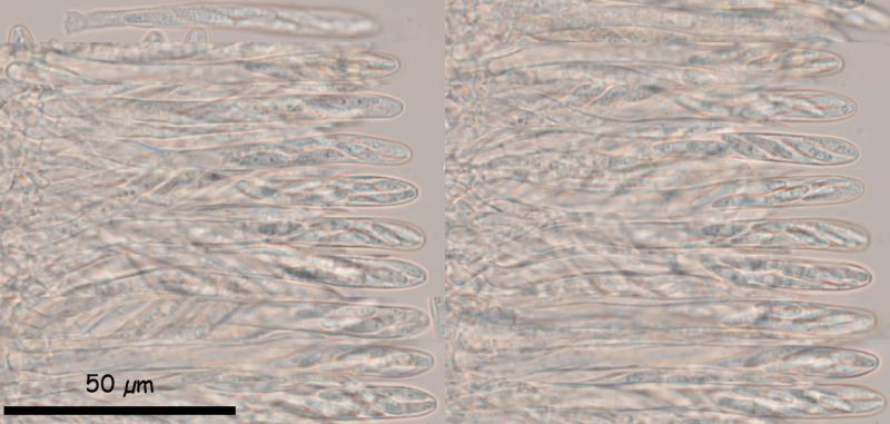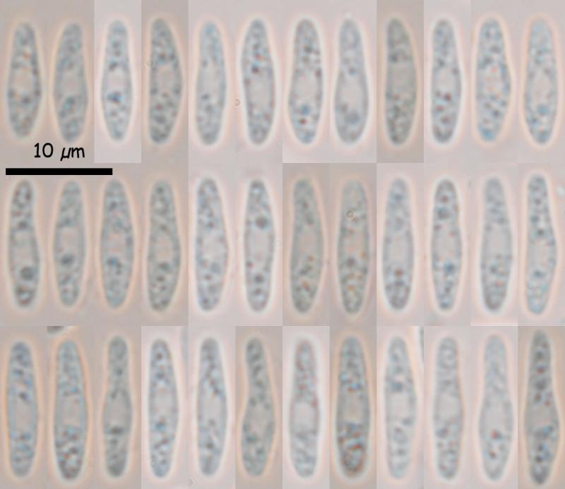 Ascosporas subfusiformes y ligeramente naviculares, con LB abundantes y pequeñas, de (10,9) 11,6 - 13,3 (14,3) × (2,6) 2,8 - 3,26 (3,3)? M; Q = (3.4) 3.7 - 4.6 (4.8); N = 40; Yo = 12.5 × 3? METRO; Qe = 4.2.