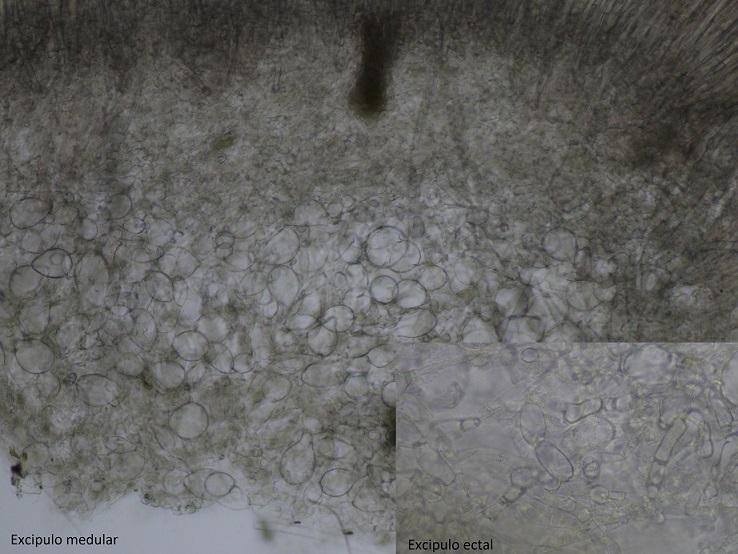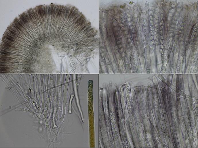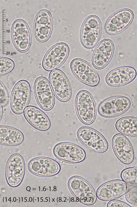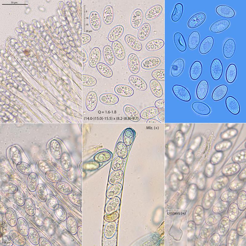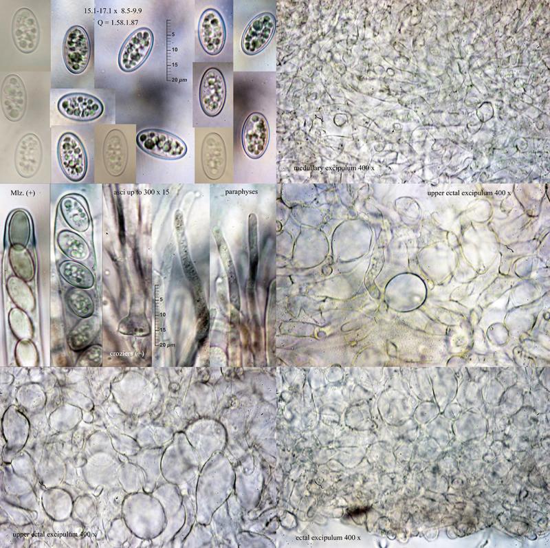 The apothecia emit an opalescent latex and the multiguttulate spores have a very fine ornamentation only visble in lactic blue.