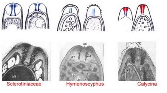 In Cyathicula (including culmicola) the reaction in IKI is similar to those in Hymenoscyphus : two parallel lines . In Crocicreas the reaction is enlarged at the top as in Calycina