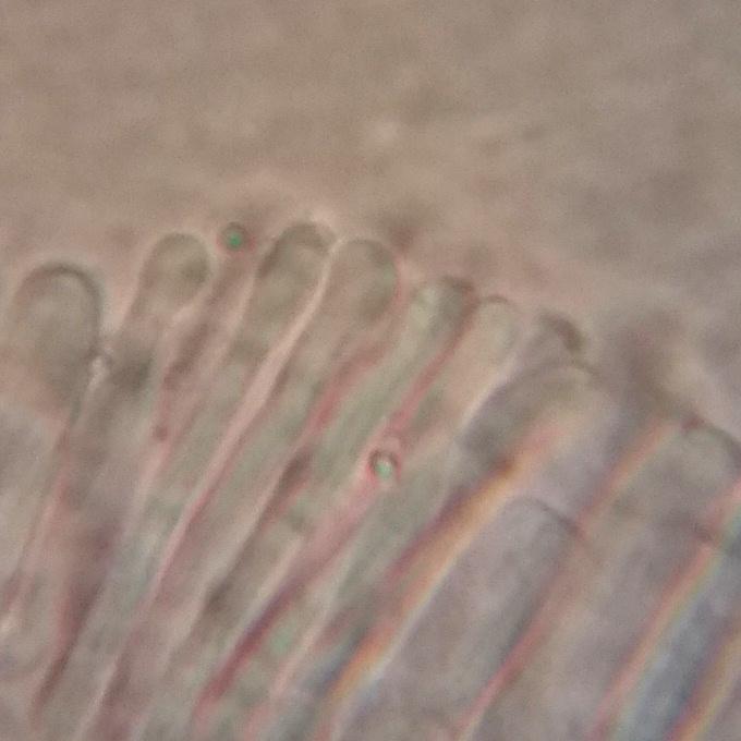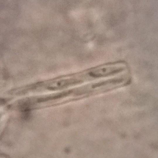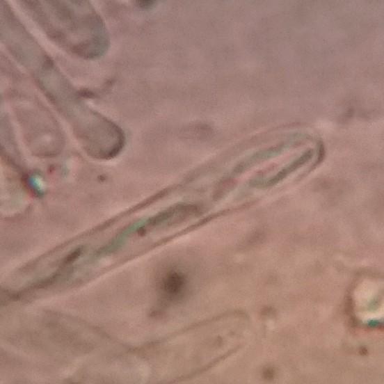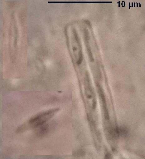 I managed to measure a few spores and they were about 8-9.5 x 1.5-2 micrometers in size. The asci were about 4-5 micrometers wide. The photos are from samples crushed in water (except one spore photo).