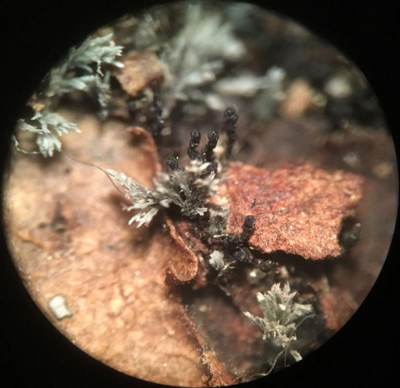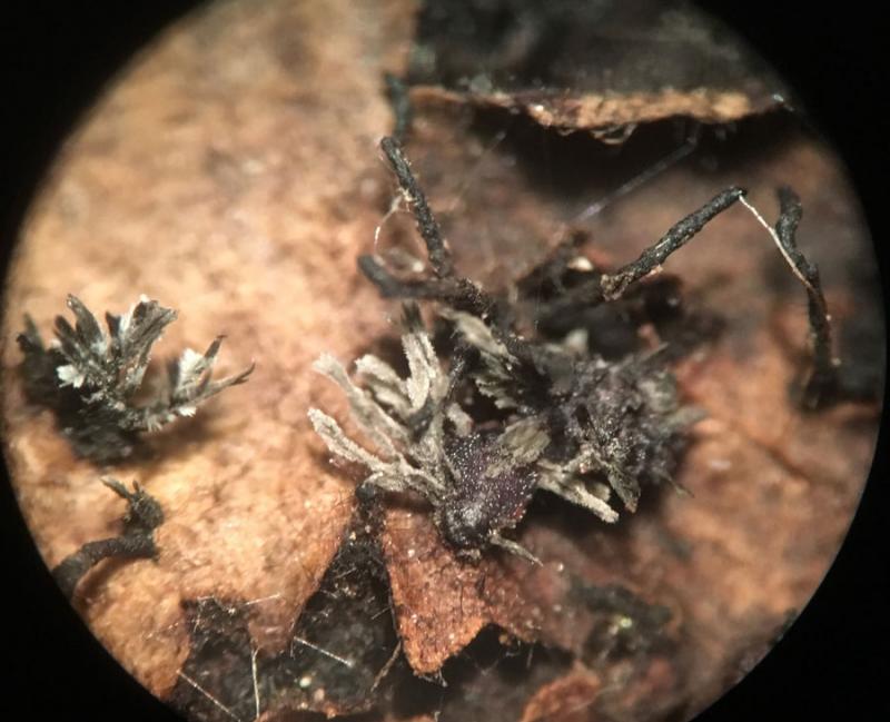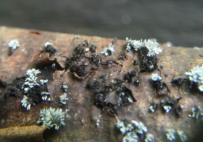 I took these photos a while back and I was wondering if they show the teleomorph and anamorph of Eutypella scoparia developing together. What I think may be the anamorph are the feathery grayish green forms that are growing among the ostiolar necks.