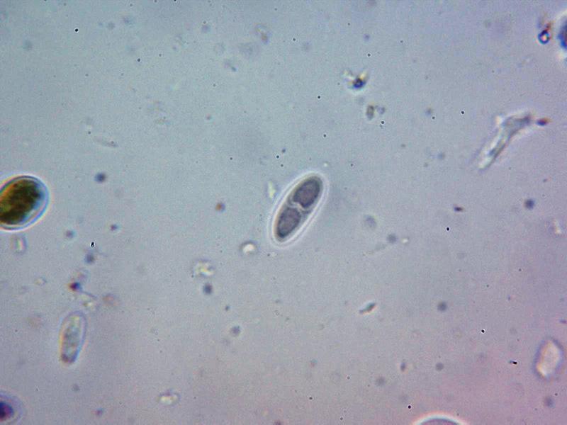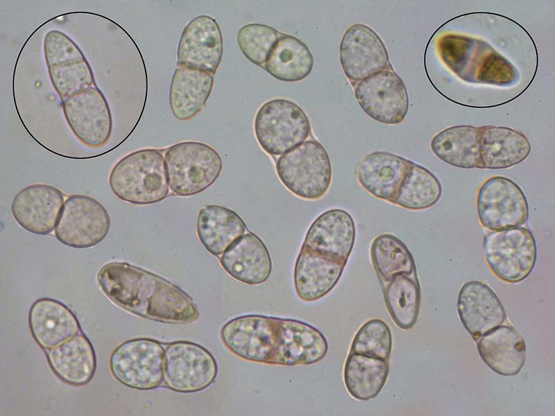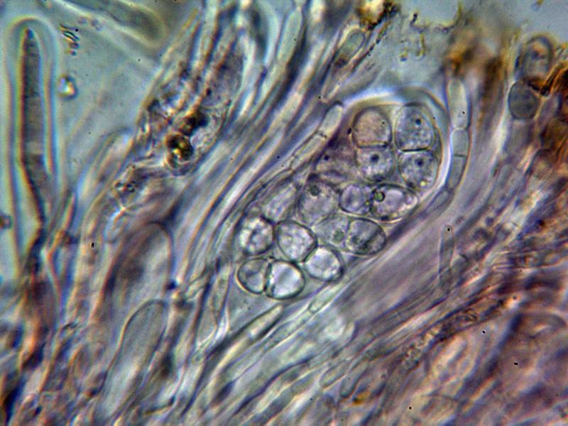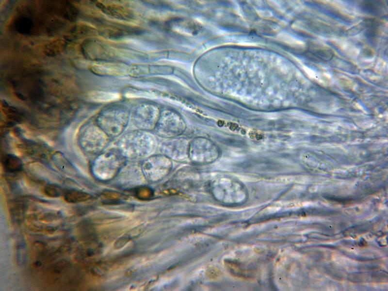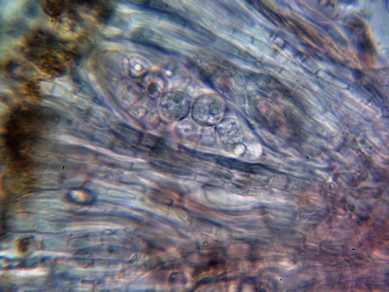 Ascas con 4 a 8 esporas, en una imágen de las ascas se pueden observar dos ascas juntas con esporas de distinta morfología.