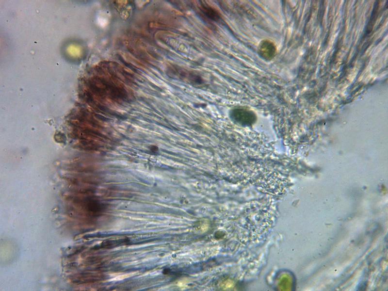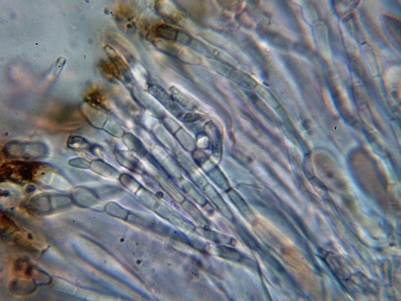 Paráfisis ramificadas, hialinas, muy septadas, engrosadas en el ápice y con sustancia opaca en su superficie.