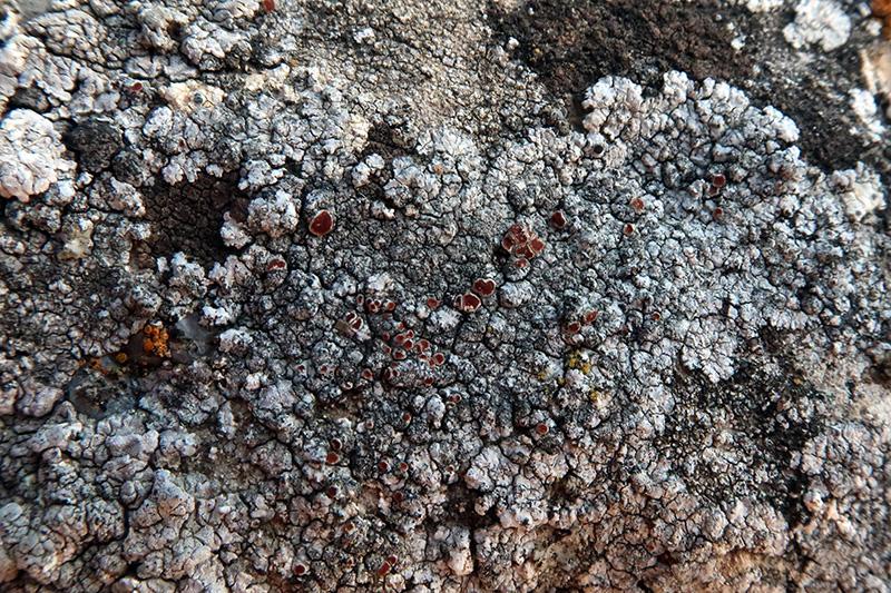 Un líquen sobre una roca caliza del pasado día 18, a 450 msnm. compartiendo espacio con lo que me pareció Lecanora aff. muralis (las medidas esporales no me encajaron, pero los demas datos apuntan a ella).