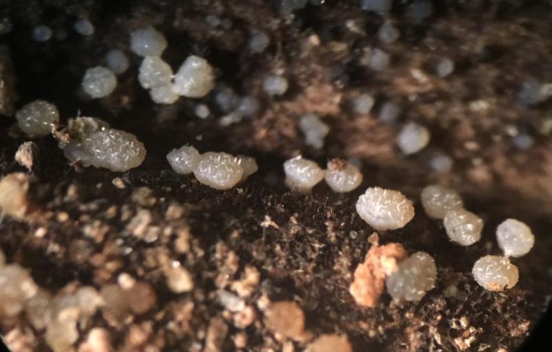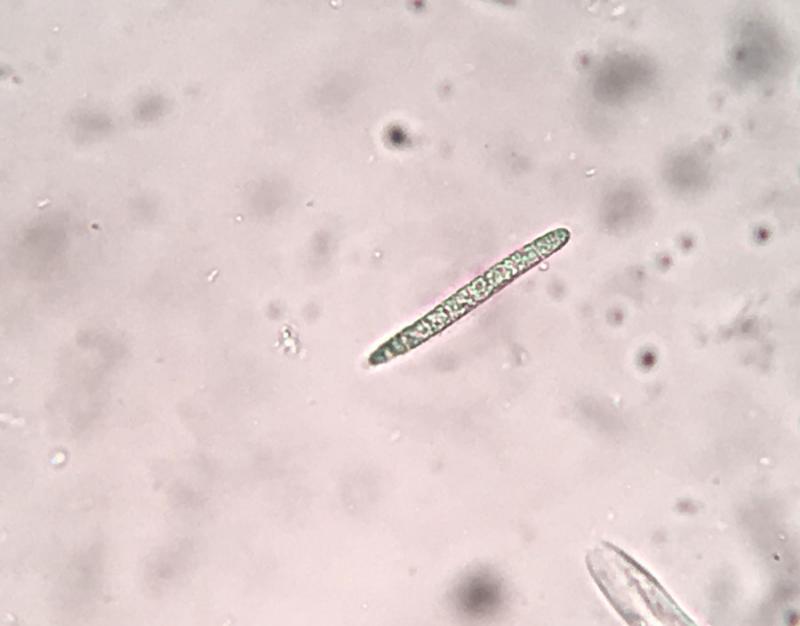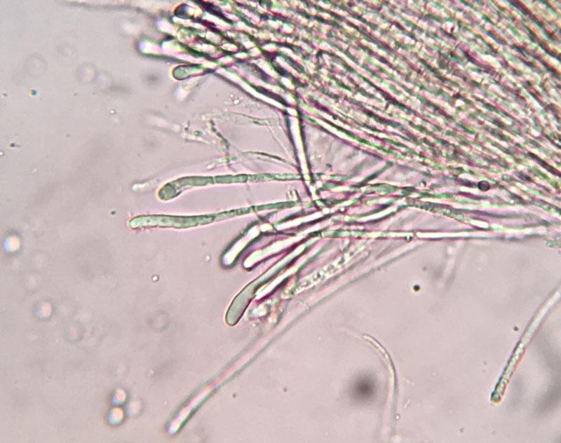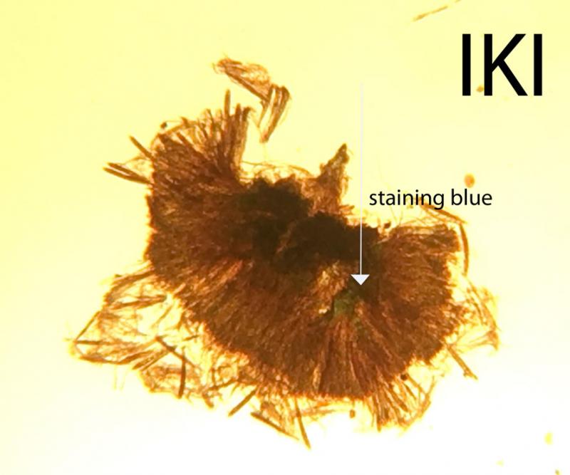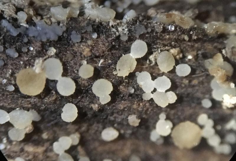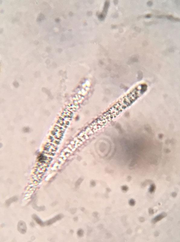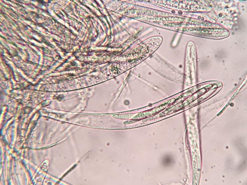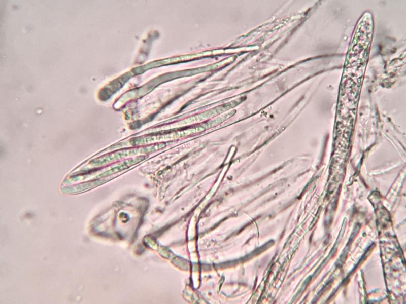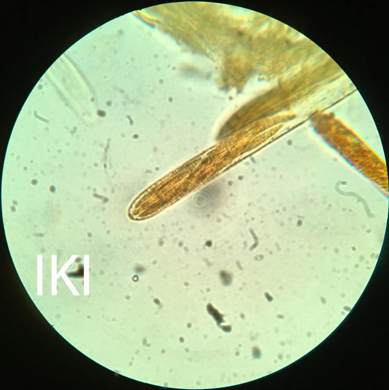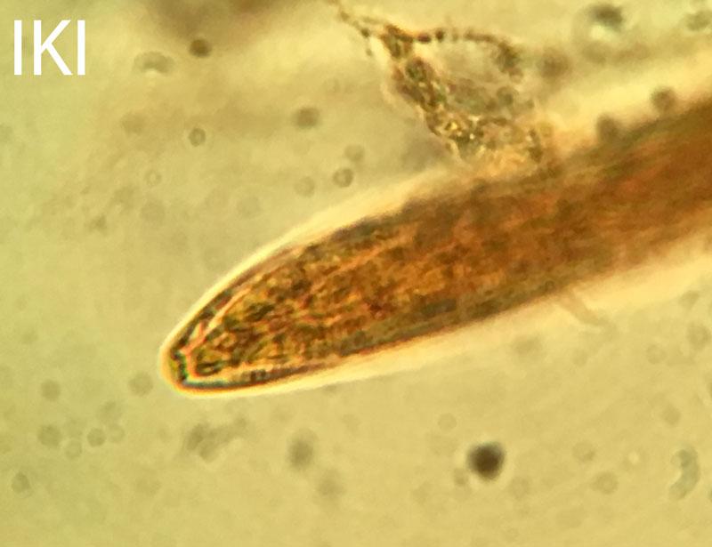 Recently I found this tiny discomycete on rotted hardwood in the Eastern US. It is white, discoloring to amber/orange, cushion-shaped, perhaps with a pseudostipe or narrowing at the point of attachment. Asci 120-150 x 12-14µm, IKI-. Spores very guttulate, 5-8 septate, 32-50 x 4-5µm. Paraphyses with irregular, swollen tips about 4-5µm wide at the widest point. One thing I noticed is that the base of the excipulum stains blue-green in iodine. This combination of features seems very similar to discussions of Strossmayeria basitricha I have read on this forum-- especially an exchange from April 2015 between Enrique Rubio and Zotto. Is this S. basitricha? Many thanks in advance.