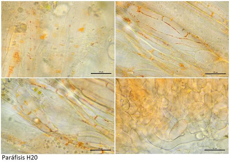 Paráfisis con septos, bifurcadas cerca de la base y pigmentos carotenoides de color naranja.