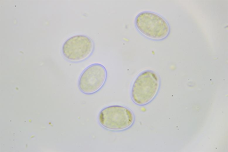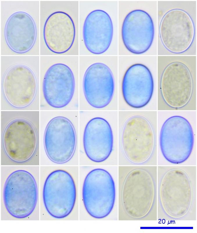 Esporas elipsoidales, con núcleo central, presenta una ornamentación muy difusa y difícil de observar, adjunto varias fotos en varios tipos de montaje a ver que pensáis? Yo creo que no están ornamentadas y son lisas.