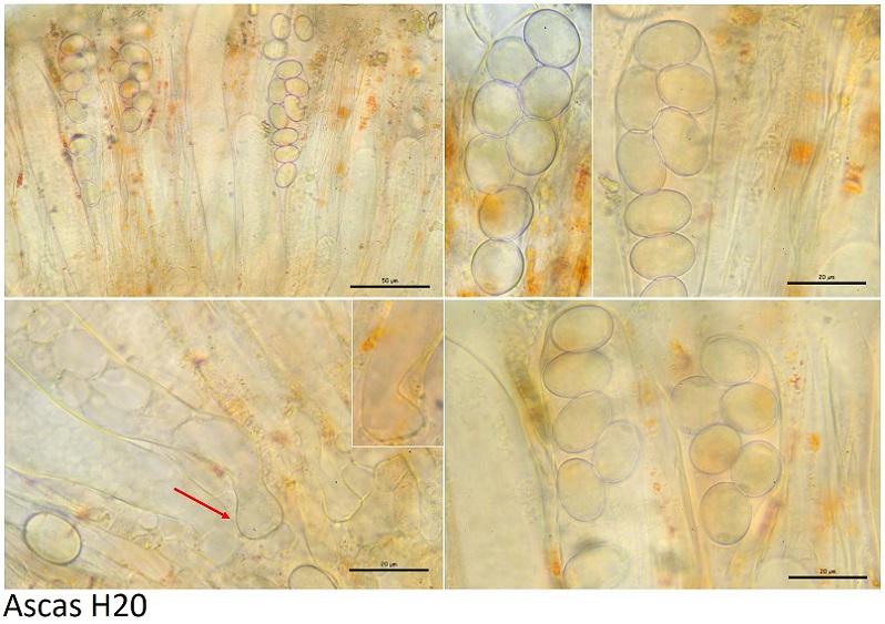 Ascas con 8 esporas, de paredes amiloides en IKI y base pleurorrincas?.