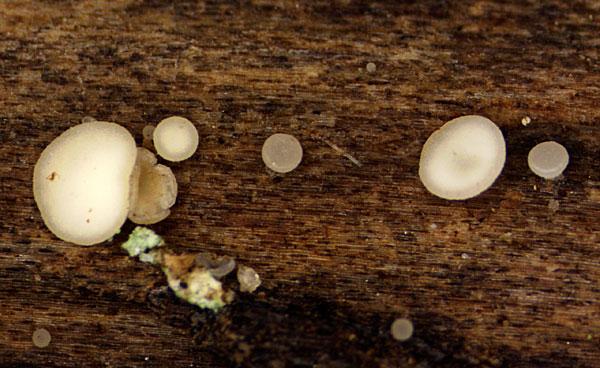 Apothecia are very short-stalked, reaching 1.5 mm diam.