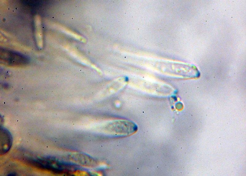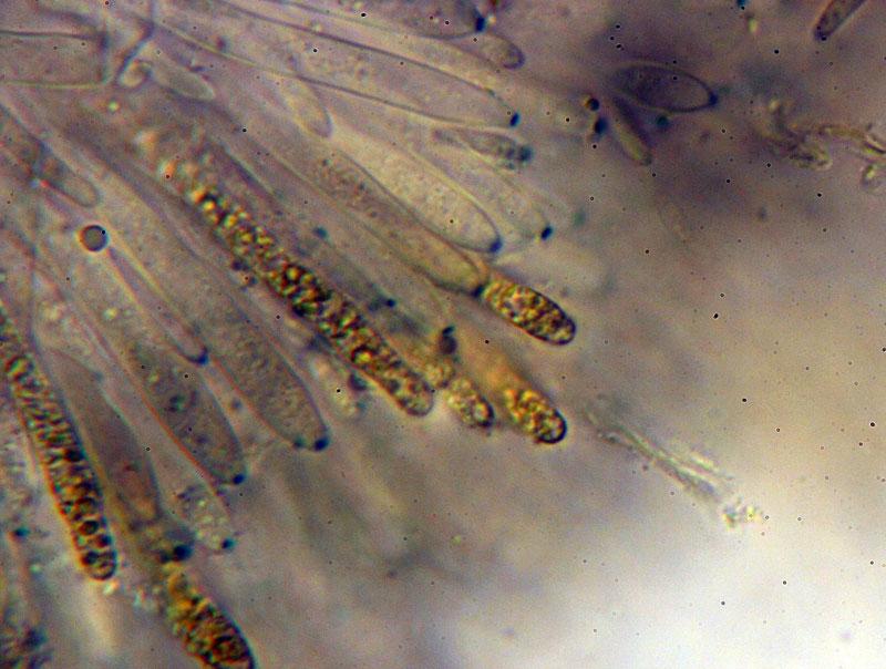 Perhaps too difficult for a "beginner", although the Calycina-like shape of the blue apical ring is not difficult to distinguish from a typical Hymenoscyphus apical ring. Apos should be cartilaginous: Cyathicula cyathoidea agg.
