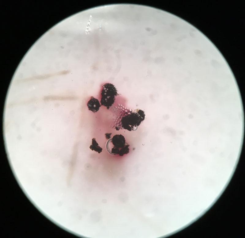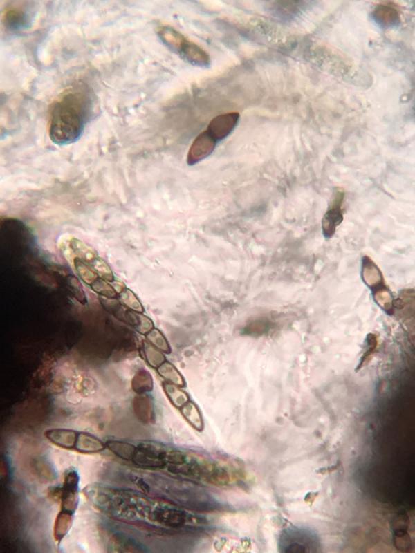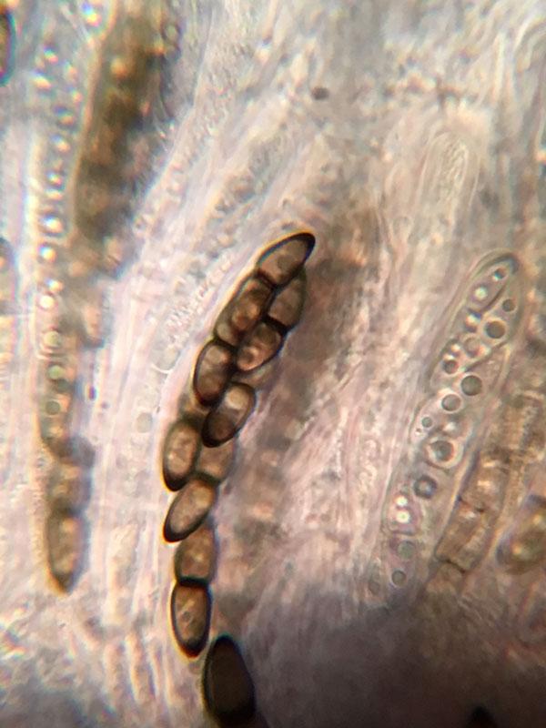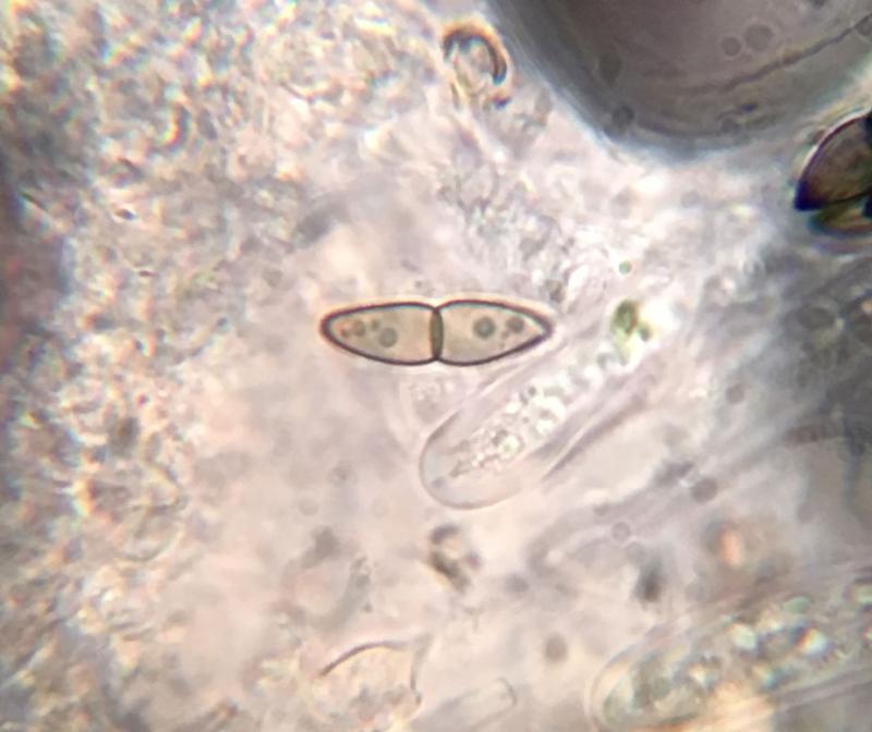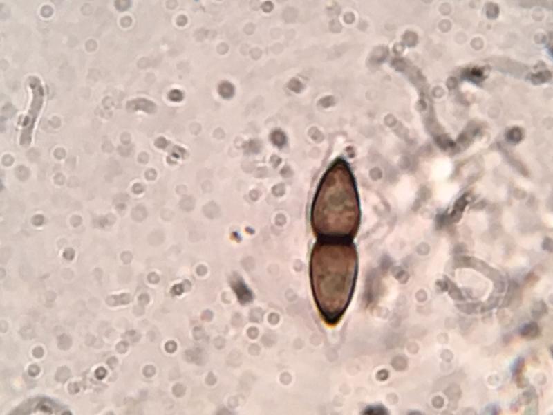 Perhaps my first photo of the apothecia was misleading, but I see no red pigmentation around the ostioles--they look dull-gray to me. With the Chacón-Zapata key this leads me to a dead end... D. diffusa spores are too small and B. jamaicana too large. With the Barr key I get stuck as well. The spores of my collection have mostly obtuse ends when less mature. In the mature spores with the darker apices, they seem more acute. I have seen no examples of ascospores that are 3-septate in any of my mounts. Perhaps I need to explore this further.