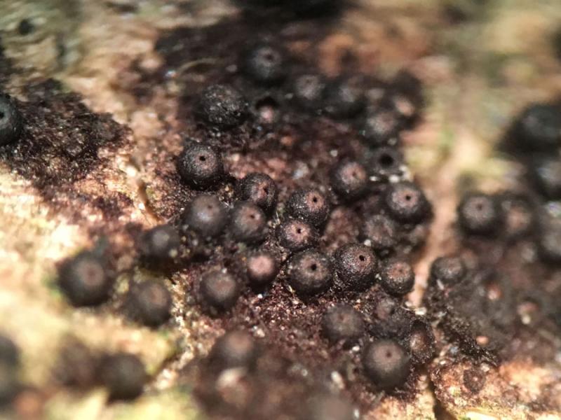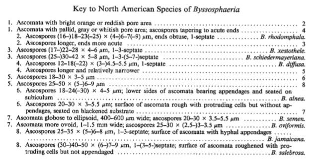 I recently found what I think is Byssosphaeria sp. near New York City. I frequently collect B. rhodomphala in many NYC parks, but this collection seems a different to me. For one thing the red pigments around the ostiole are not pronounced--this is a fairly large collection and I usually see some red somewhere. The spores seem quite a bit darker brown with the ends of the cells quite dark brown. I see a sheath around the spores and/or hyaline spore appendages at the ends of the spores. Spores measure 17.5-23 x 5-6µm. Asci about 109 x 11µm. Perhaps I simply collected over-mature fruiting bodies of B. rhodomphala that lost the red pigmentation around the ostioles. But I have been going through Barr's key in her Melanommatales paper (key pictured) and puzzling over other possibilities. Does anyone have any input they can provide? Thank you in advance.